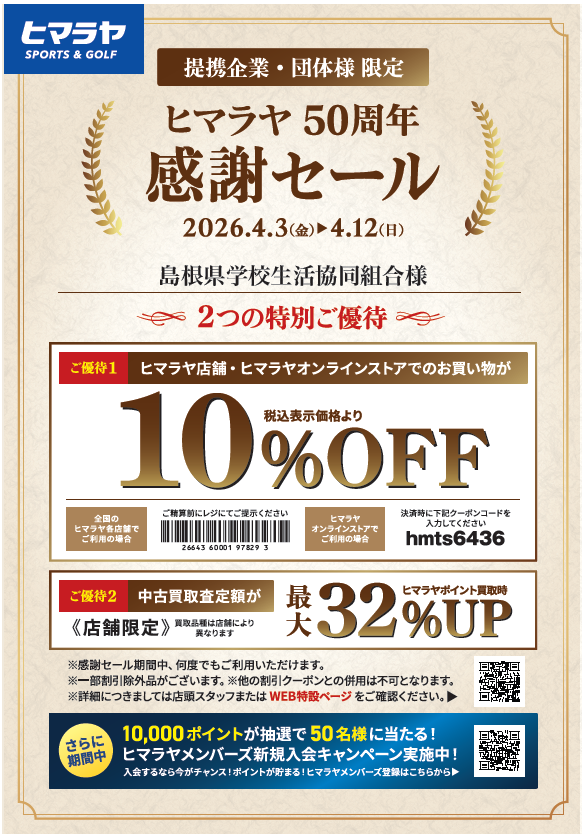 期間中は店頭表示価格よりさらに10%OFF(一部除外品あり)にて、全国のヒマラヤ店舗およびオンラインストアでご利用いただけます!