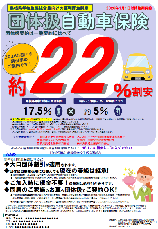 現在の位置:トップ / 指定・提携業者 / 保険・共済 / 大口団体自動車保険 / 2026年大口団体自動車保険